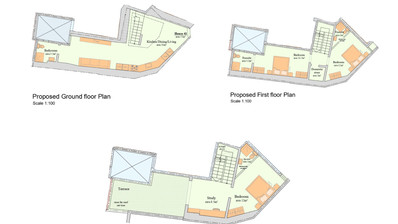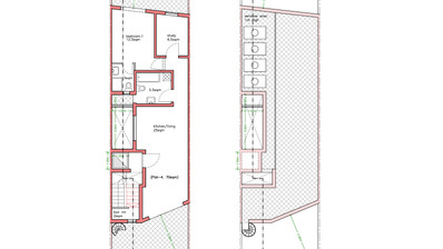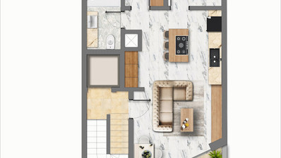 The open-plan kitchen, living, and dining area leads to a front terrace overlooking the piazza, offering a beautiful outdoor space. The bathroom features a luxurious bathtub, and the double bedroom has direct access to the terrace.