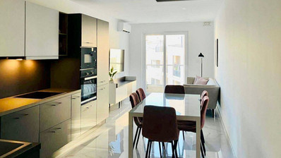 The 25 sqm open-plan kitchen/living/dining area opens onto a spacious front terrace, which includes a spiral staircase leading to the private roof terrace—perfect for outdoor living and entertaining.